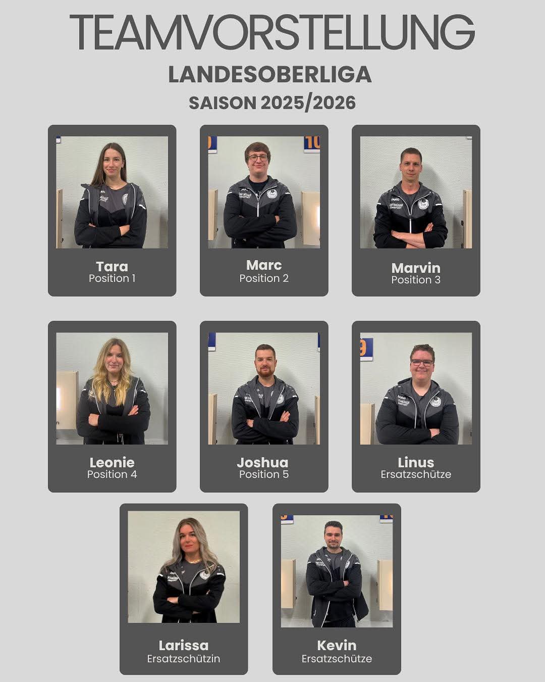 Schützenverein Elkhausen-Katzwinkel eV Mitglied im Rheinischen Schützenbund e.V. 1872 Landesoberliga Saison 2025/2026 Ihr Titel Tara Becher Alter: 18 Jahre Seit: 2023 fest in der Mannschaft Hobbys: Schießen, Krafttraining, Laufen & Gitarre spielen Beruf: Schülerin Persönliche Bestleistung (PB): 397 Ringe. Ihr Titel Marc Alter: 28 Jahre Seit: schon ewig Teil der Mannschaft Hobbys: Sportschießen, Zelten, Videospiele & Lesen Beruf: Destillateur Training: 390 Ringe Wettkampf: 389 Ringe Ihr Titel Marvin Alter: 27 Jahre Seit: Beginn der Mannschaft Hobbys: Fahrrad fahren, Angeln, Baustellen Beruf: Elektrotechniker Persönliche Bestleistung (PB): 396 Ringe Impressionen